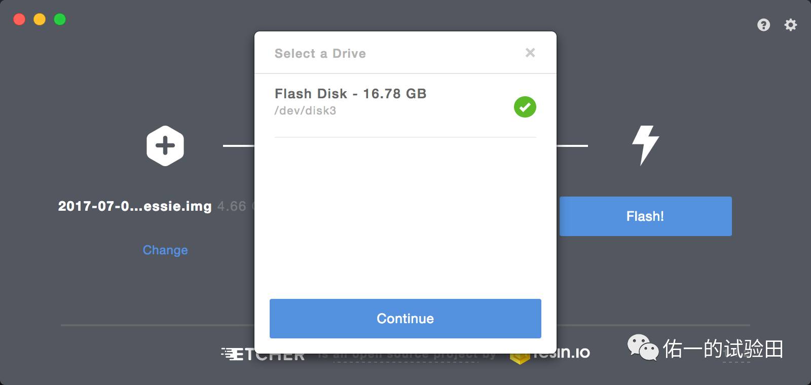 3)Select drive:选择安装介质,也就是我们已经插入电脑的TF卡(这一步一般会自动识别,如果Mac或PC插有多个移动介质,请认准我们将要使用的TF卡)