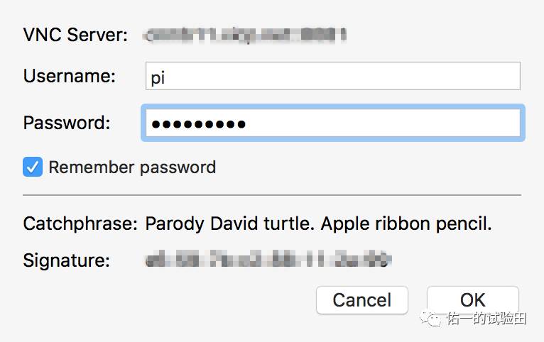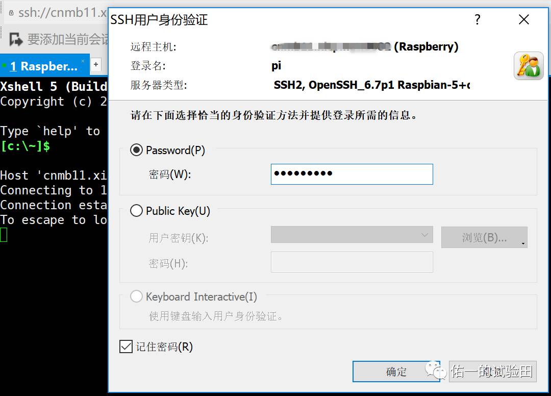 4) 在弹出来的认证界面输入 用户名(pi)和密码 ,选择 记住密码 ,点 OK ;