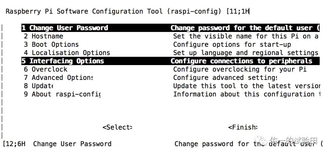 1) 在 pi@raspberrypi:~$ 后输入 sudo raspi-config ,通过 上下按键 在弹出的界面中选择 5 Interfacing Options ,按下 return或回车 ,再点击 OK ;