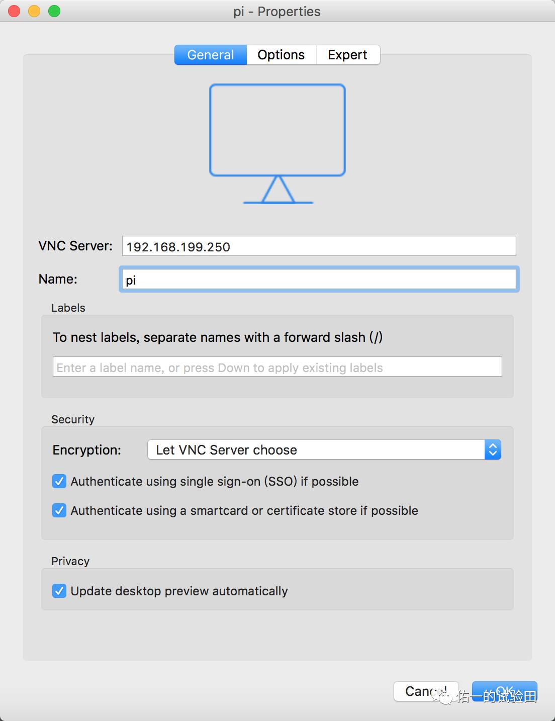 2) 在 VNC Server 后填写 树莓派的IP地址 ,在 NAME 后任意填写 你想看到的名称 ,点击右下角的 OK;